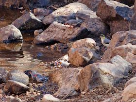 In the background of this photo is a young Long-tailed Finch Poephila acuticauda, here at the south-eastern edge of its tropical distribution. I hadn't expected to see them here, and it was one of four finch species which visited while we watched. Another finch gave us perhaps the most pleasure though, as we'd missed it in central Australia, and this was really our last chance for the trip.