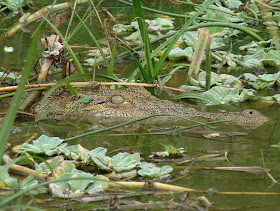 The Nile Crocodile Crocodylus niloticus story in the channel is a fascinating one. Until the 1950s they weren't found at the western end of the channel - it is suggested that this was related to the volcanic event which formed the channel. Then however, people began to cut paths through the forest alongside the channel, and the crocodiles were able to use them to bypass the rapids which had hitherto thwarted them.
