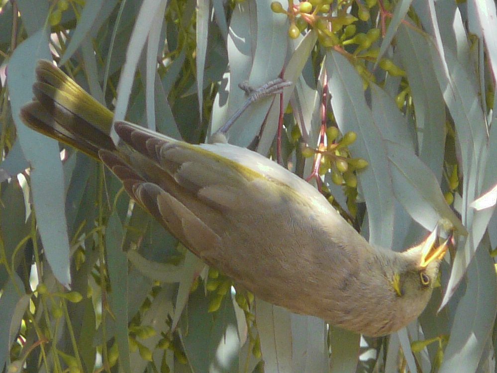 | Fuscous Honeyeater Ptilotula fusca Jerrabomberra Wetlands, Canberra. Hanging upside down is an effective way to access the underside of leaves. |